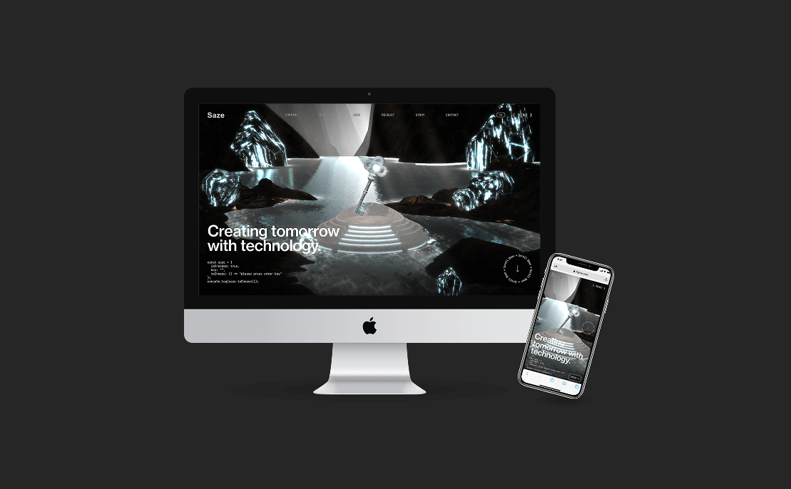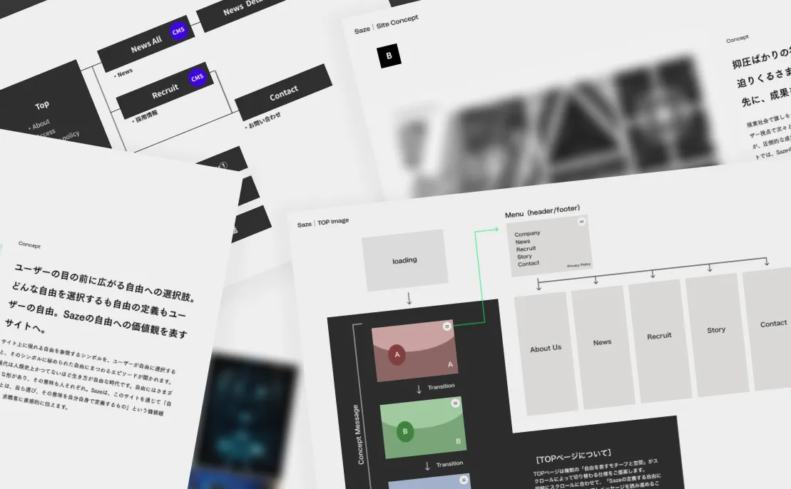 従来のコーポレートサイトには、会社の技術力や文化、そして未来へのビジョンを十分に伝えきれていないという課題がありました。そこで私たちは、単なる情報羅列に終わらない、ユーザーにSazeの魅力を伝える圧倒的な体験を提供するWebサイトを構想しました。